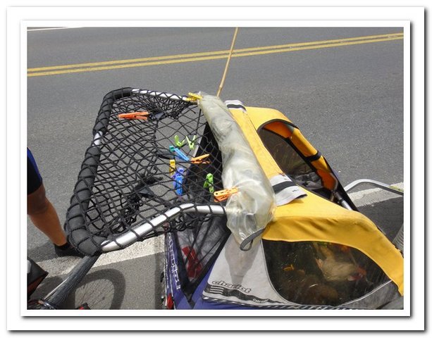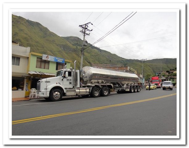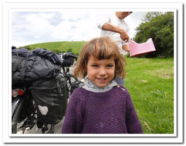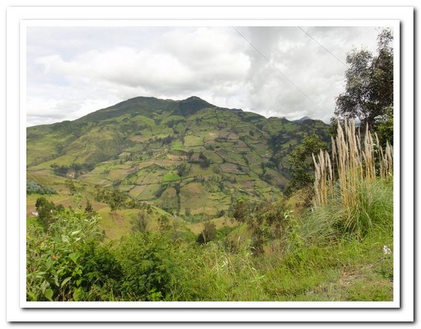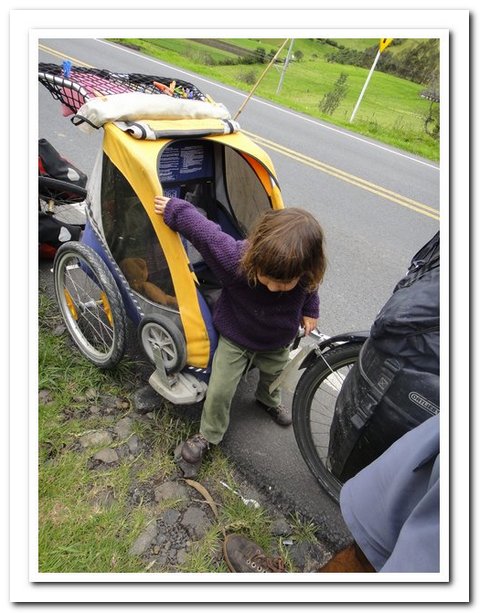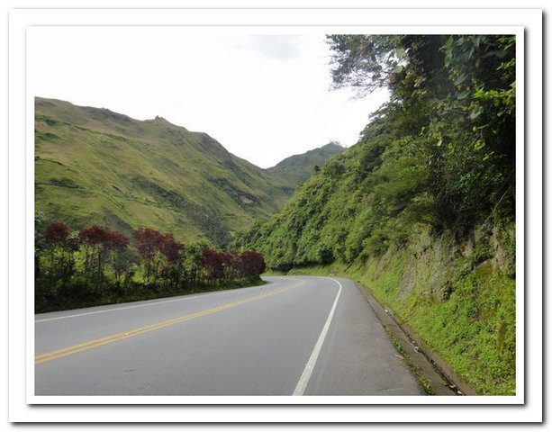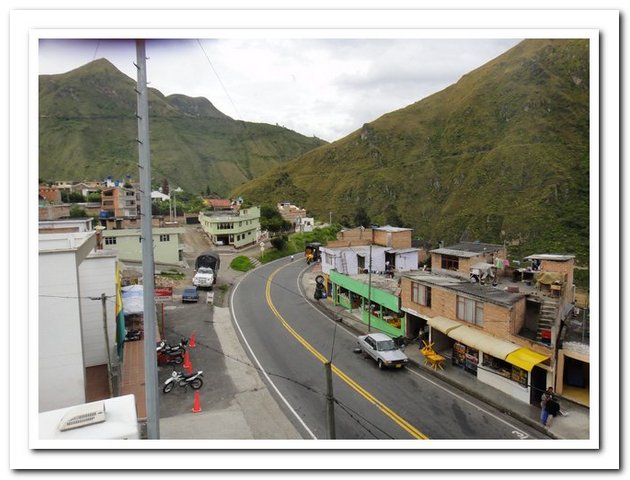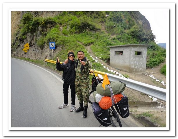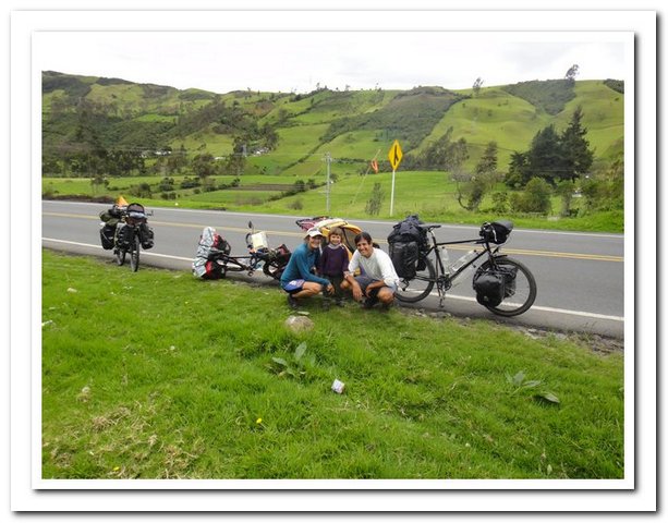 Départ tardif indépendant de ma volonté (je ne pars que vers 9 heures car une personne de l’hôtel s’est mise en tête de faire avec moi tous les magasins de Pasto pour trouver des tendeurs pour fixer mes deux sacoches arrière, au bout d’un moment j’ai dit stop, sinon je vais me faire saucer encore comme c’est pas possible, je pense que ce retard m’a permis de rencontrer : un couple de suisses super sympas et… un couple belgo-espagnol qui m’avait contactée par voyage forum quand ils sont arrivés à Caracas et quand ils m’ont vue ils ont dit « ah vous êtes la femme dont on entend parler depuis deux mois… », je savais que j’étais connue mais pas tant que ça. Ils voyagent avec leur fille de 3 ans dans une carriole et elle attend son deuxième, ils se poseront en Argentine pour la naissance du bébé et on a super sympathisé, mais vraiment super.