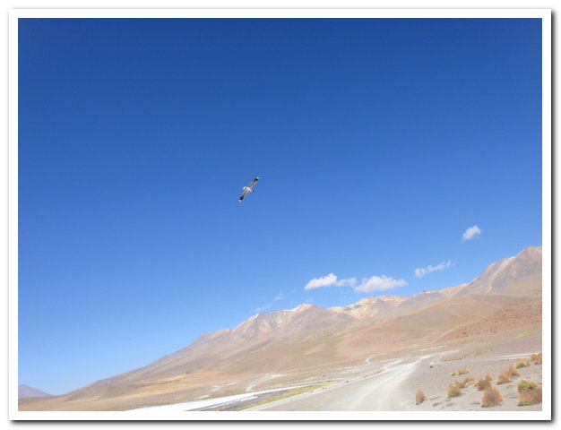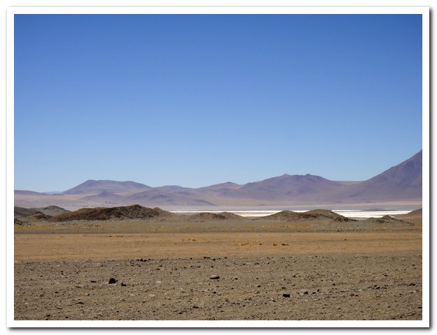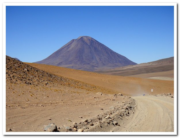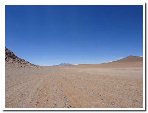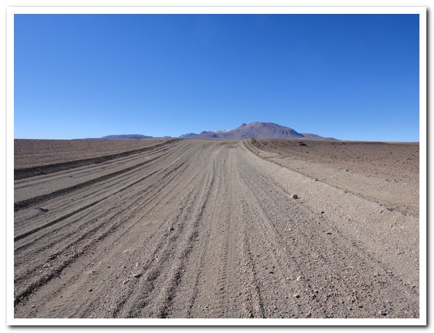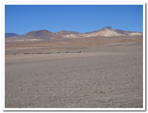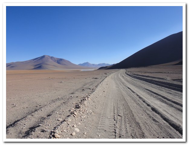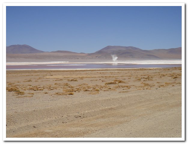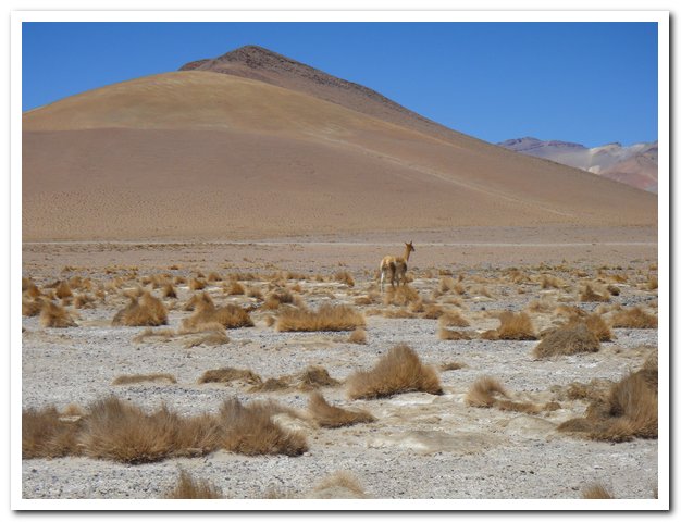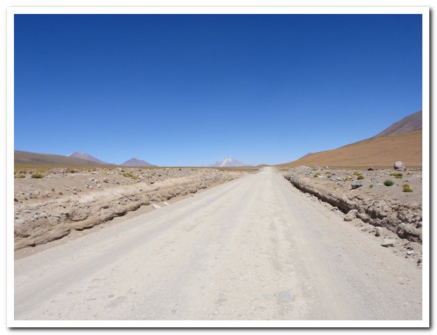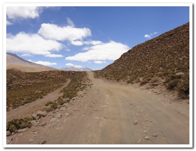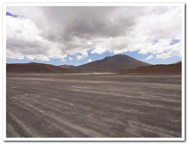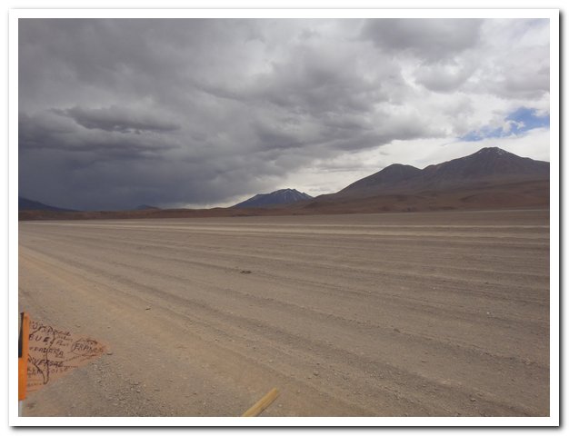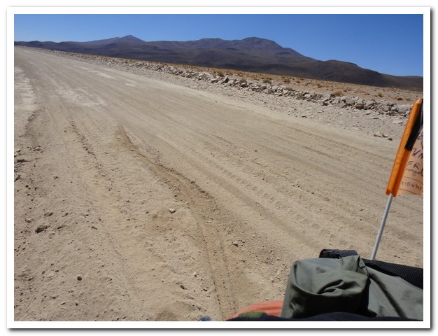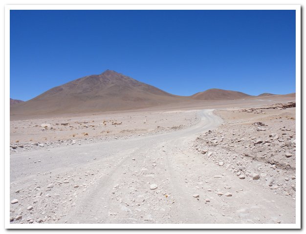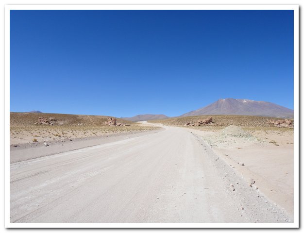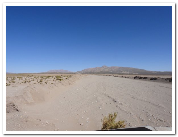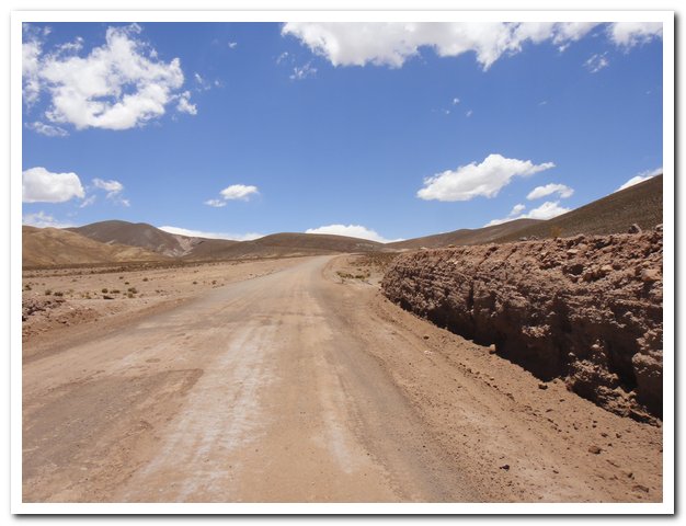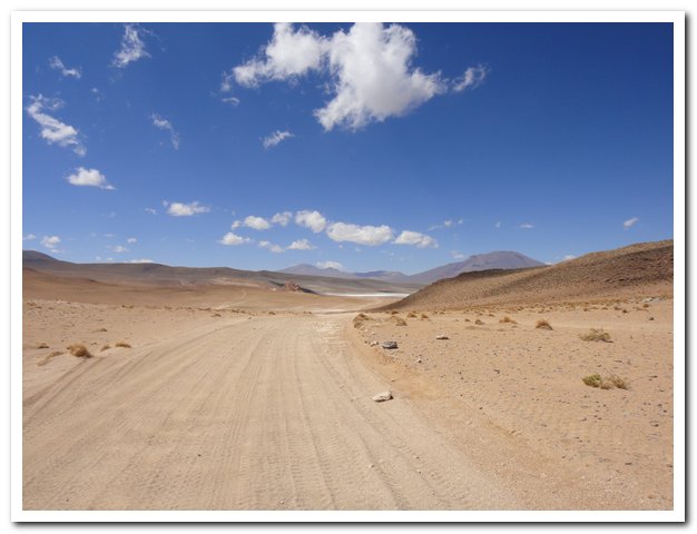 Une moto passe, on discute… Bin la piste sur laquelle je suis c’est celle qui va au volcan Ollague et donc rejoint la piste qui va à la laguna Hedionda, donc la piste infernale des touristes en mal de sensation forte (en 4X4) et des cyclo ultrafêlés… « Combien de temps jusqu’à la bifurcation ? » « Deux heures de moto ». Allez la piste me plait, pas mauvaise, pas de circulation, je me sens en forme, j’y vais…Enfin, le temps de ramasser mon vélo qui subit sa nième chute… J’ai quand même peur de manquer d’eau…