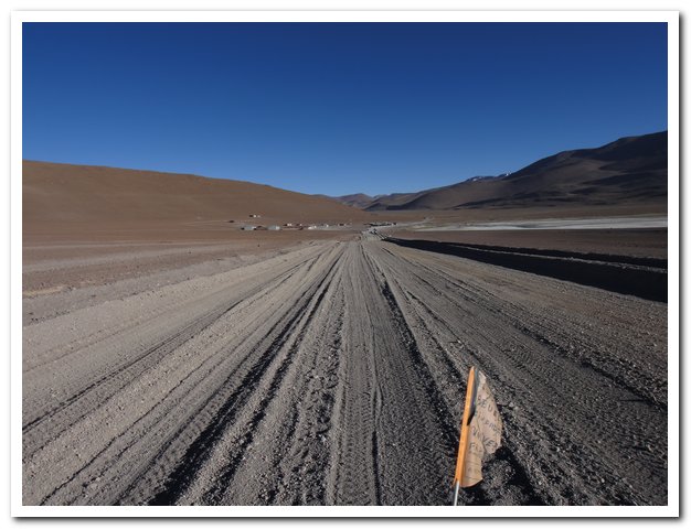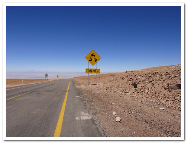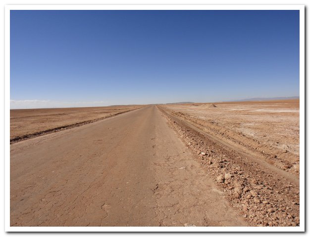 Je croyais que la traversée du dsésert d’Atacama ce serait de la rigolade après celui du Lipez, pas du tout, à partir de 13, 14 h tu ne peux plus rouler, le vent m’a jetée par terre, je faisais du 4 à l’heure sur du plat et du goudron (j’étais plein ouest, y avait un tas de sable…. J’ai mis mon matelas le duvet et attendu que le matin viennne, apèsè entre 20 et 30km/h, je vais donc devoir mettre en place une nouvelle stratégie contre le vent….