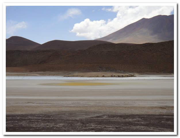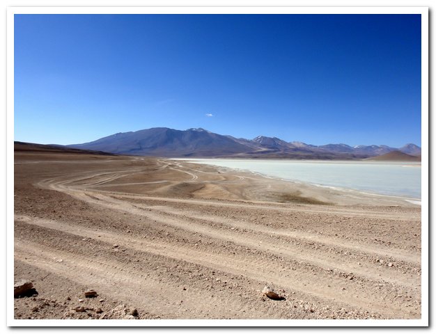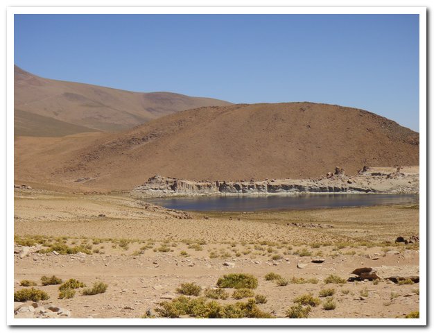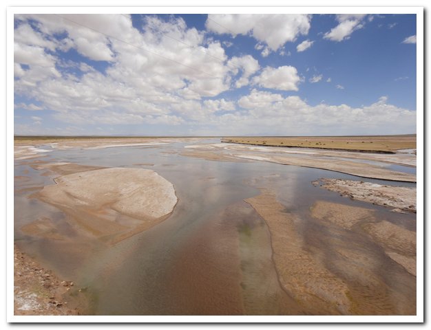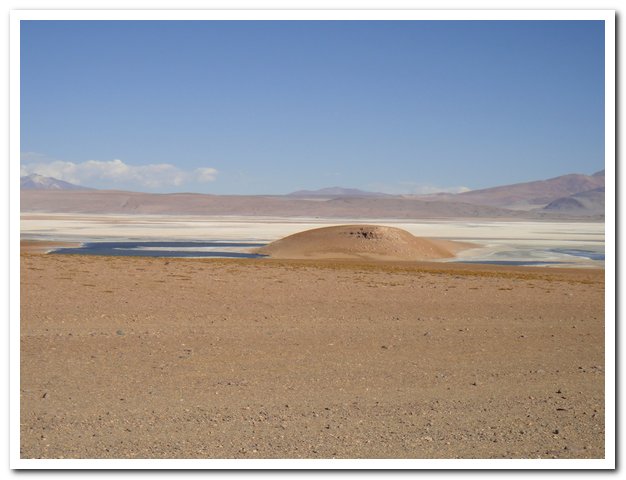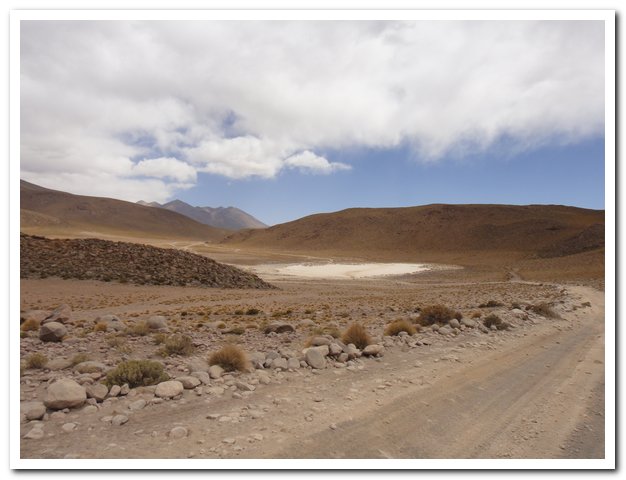 J’avais décidé de manger à l’intersection, mais devant le mur j’ai préféré retarder, et là-haut j’ai trouvé une piste de sable et un violent vent de face, alors j’ai retardé… Puis j’ai craqué et mangé… Puis les 5 ou 6 4X4 rencontrés ont disparus, puis le kilométrage du topo était faux et la Laguna Hedionda jamais là… En revanche un petit salar indiqué sur aucune de mes cartes…A un moment j’ai posé mon vélo et suis allé voir plus loin, une laguna, pas l’Hedionda, la Canapa…