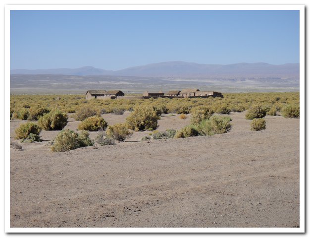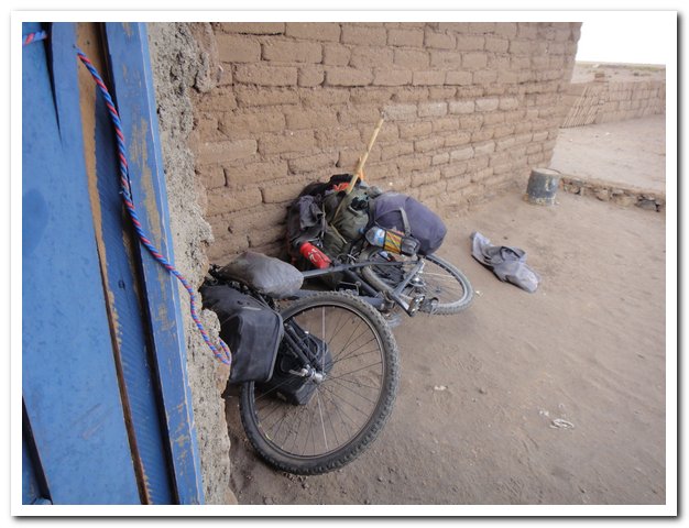 Je mange avec les propriétaires un bol de pâtes pâteuses où nagent trois minuscules morceaux de lama, mais ce n’est pas mauvais et je ne serai pas malade… Il y a deux « tienda » avec RIEN, si je vais trouver des snickers Les snickers, mon luxe depuis Cusco, le luxe aussi des français qui me tracent…), du coca, de l’eau, rien de plus. Je passerai une excellente soirée avec des touristes dont le médecin suisso-bolivien, eux se lèvent à 4h30 pour partir à 5h30, oui, dur la vie de touriste… Leur babillage me réveillera doucement, pour moi le lever est à 5h30, oui, dur la vie de cyclotouriste… A 7 heures je suis partie, je ne passe pas trop mal la partie difficile (sable, tôle ondulée). Je suis en super forme…