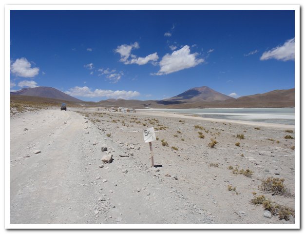 Un camion en panne fait bloquage aux deux autres camions de la journée. Deux personnes attendent un hypothétique bus, « pour aller à la laguna Hedionda c’est la piste à gauche », je me méfie, déjà la route indiquée pour Tres Cruces j’ai du faire du portage, c’est plus court me disent-ils, oué sauf qu’il n’y a strictement personne « Et là aussi il n’y a personne » « Si 2 ou 3 véhicules par jour » Je joue la sécurité et décide de faire le tour du cerro et de rejoindre la piste indiquée sur mon topo…