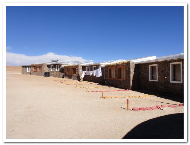 En premier lieu « l’hôtel del desierto » et son personnel, ils ont récupéré une épave (ne vous inquiétez pas ont-ils dit, tous les cyclotouristes arrivent ici dans le même état) et ont réanimé l’abuela cyclo plus fluo à coups d’excellente nourriture, de douche chaude, de lavages de vêtements, en m’offrant une chambre de luxe au prix de la chambre de bonne, en me donnant de l’eau, des bananes, des sucettes, en partageant avec moi leur repas de midi, en me racontant leur vie si difficile dans le désert, 3 mois de travail de 5 heures du matin à 23 heures, 18 jours de repos à la Paz, en allant jusqu’à me proposer de demander à un 4X4 de m’emmener à la Laguna Colorada, en ayant tellement peur pour moi, merci aussi à la communauté qui a mis 12 mois à construire cet hôtel tout en pierre et écologique (presque, il y a quand même les générateurs pour puiser l’eau du puits et donner de l’électricité aux touristes en soirée)