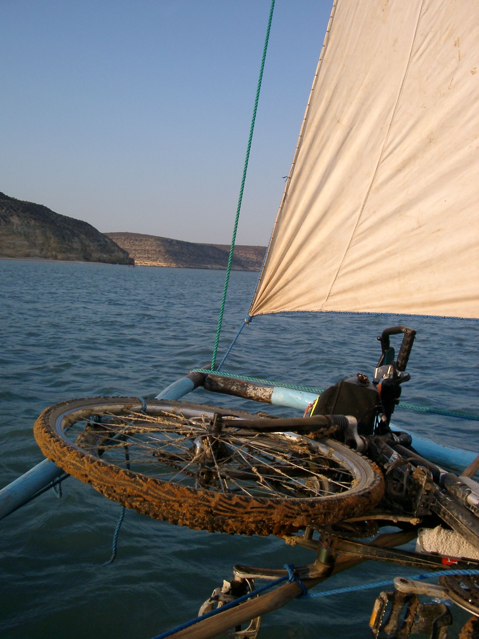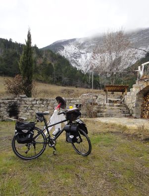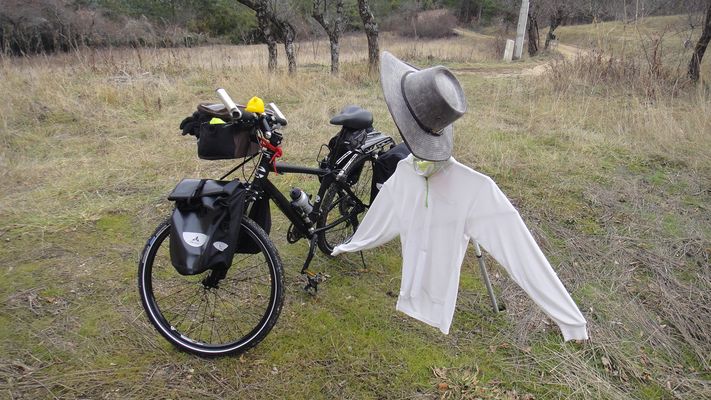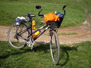 Vélo de marque « Canondale » de type randonneuse, cadre aluminium, vélo d’origine modifié : fourche remplacée par une fourche amortisseuse, roues remplacée par des roues VTT, selle remplacée par ma selle adorée (royale de chez décathlon), installation de porte bagages avant et arrière, d’une béquille latérale solide, d’un rétro (que je démonte avant le départ pour éviter la casse), difficultés pour installer un deuxième porte-bidons, déconseillé de repercer, risque de fragilisation du cadre, Finalement porte-bidon pour petit bidon sous la selle.